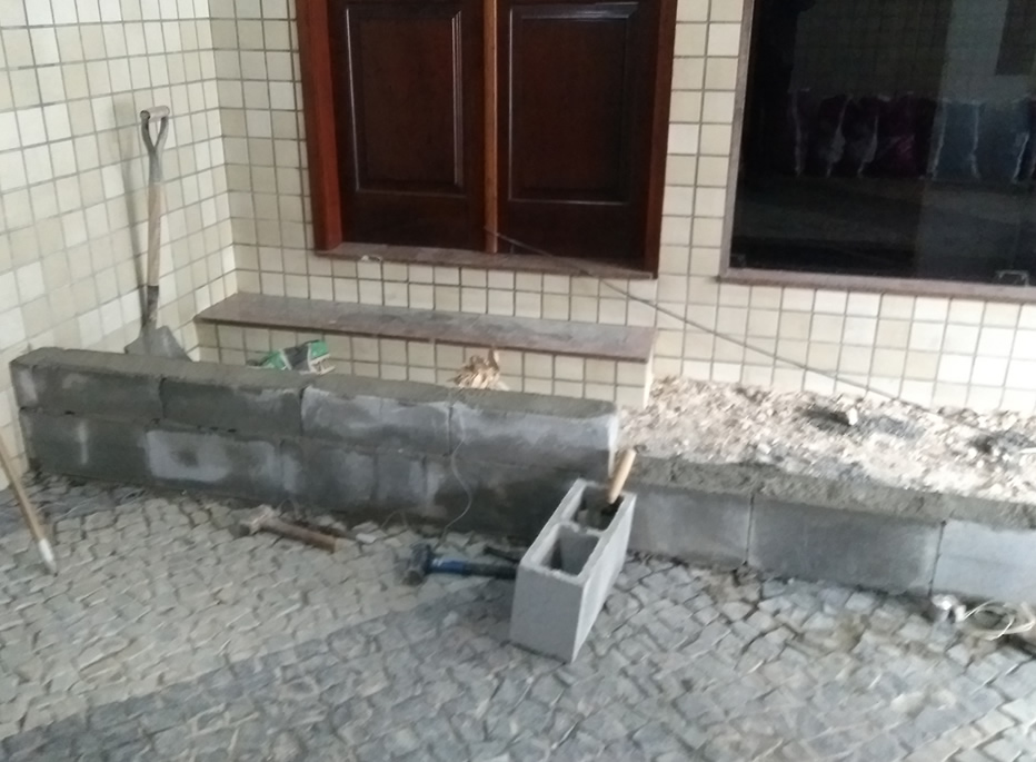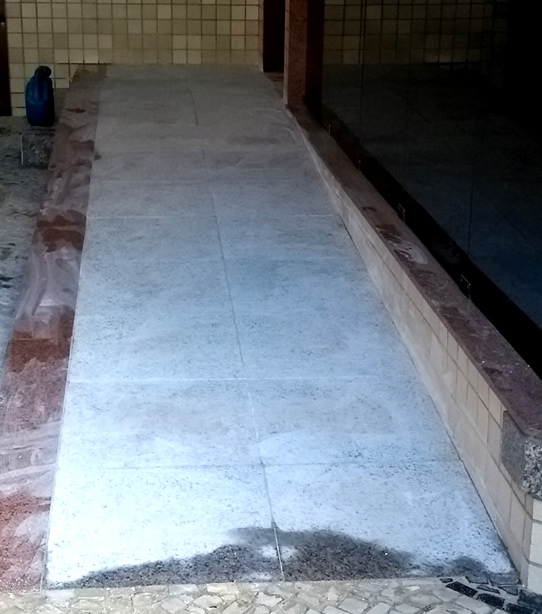 Reforma de portaria 73m² para criação de rampa para acesso de PNE Portadores de Necessidades Especiais, com revestimento em granito antiderrapante, flameado, recomposição de alisares, portas e do piso lateral em pedra portuguesa.